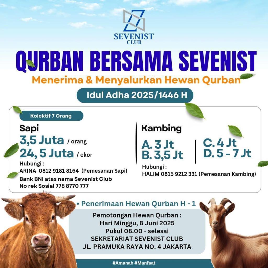 ‘Qurban Bersama Sevenist’ adalah bentuk kepedulian kita bersama terhadap alumni, almamater dan masyarakat luas tanpa kecuali. Sekaligus acara Silaturahmi SC lintas angkatan, kita BBQ dan makan2 bareng. Dengan melibatkan semua member & pengurus. Bagi pengkurban ada kuota yang dapat dibagikan kepada yg diinginkan (hub. Tim Panitia)