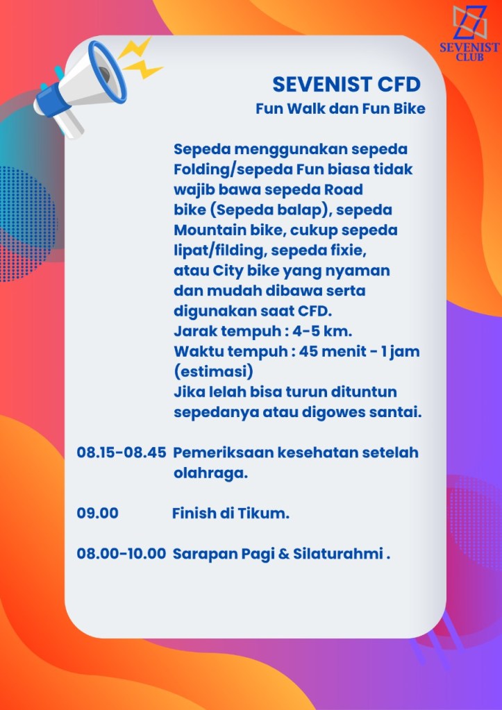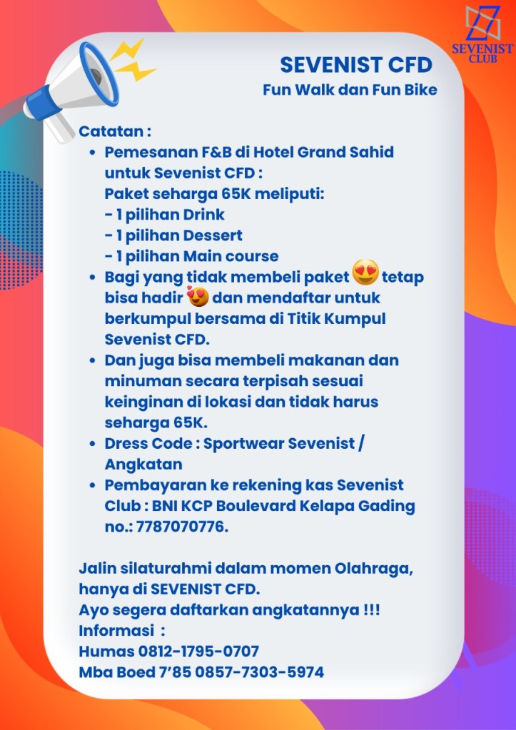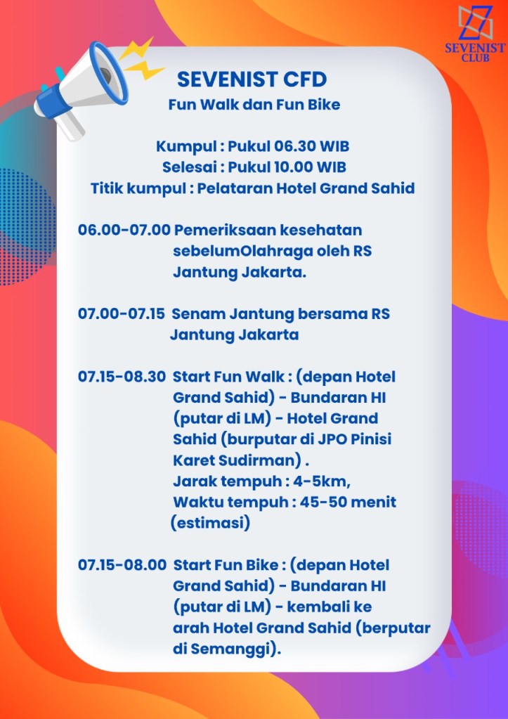 Ramaikan Sevenist CFD Minggu 13 Juli 2025 Pukul 06.30. Tikum : Hotel Grand Sahid.