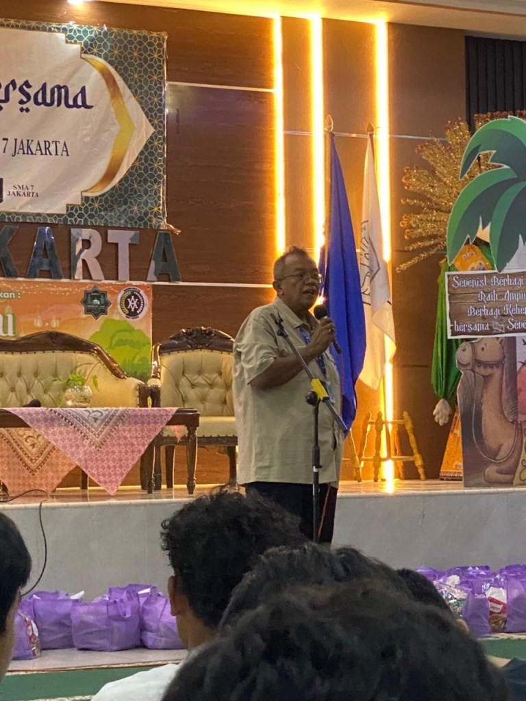 Sambutan berikutnya disampaikan oleh Pak Bandi, Ketua Paguyuban Guru Pensiun SMA 7 Jakarta. Ia mengungkapkan harapannya agar kegiatan seperti ini dapat terus dilakukan sebagai bentuk kolaborasi antara alumni dan para guru.